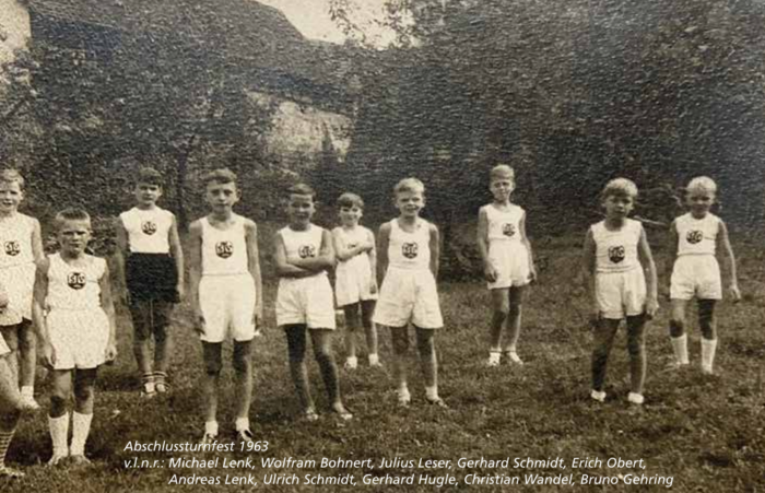 Das Abschlussturnen 1961 – ich war schon auf dem Gymnasium – fand wie seine Vorgänger unterhalb der Gemeindehalle auf einer abgemähten Wiese statt, die damals dem Obertsbauern gehörte. Es war ein nicht zu heißer Sonntag im August, und nachdem meine Altersgruppe ihr Programm vor Publikum mehr schlecht als recht absolviert hatte, verdrückten wir uns schnell in die Reihen der Festgemeinde, wo auch unsere Familien an den Biergartentischen saßen. Wir tobten über die Wiese, um unsere Anspannung loszuwerden. Gegen Ende des Nachmittags saß ich mit Kameraden versteckt auf dem Gras unter dem Bretterboden der Musikbühne und nuckelte an einer Flasche Sinalco, als ein Klassenkamerad aufgeregt angerannt kam und uns zurief, dass die Russen kommen würden, und es gäbe Krieg, und der Bürgermeister wolle alle nach Hause schicken und das Fest wäre aus und vorbei (es ging aber doch noch bis in den Abend lustig weiter). Wie wir jetzt wissen, brach an jenem Tag nicht der Dritte Weltkrieg aus, aber die Berliner Mauer wurde vom selbsternannten Arbeitersportler Ulbricht errichtet, und meine Mutter ließ mich in den nächsten Tagen nur ungern in die Ferien nach Berlin abfahren. Es war eines der letzten Abschlussturnfeste. Die den Anforderungen einer modernen Freizeitgesellschaft nicht mehr genügende Gemeindehalle fiel bald der Abrissbirne zum Opfer, und irgendwie war nach jenem Sommer die Kindheit vorbei.*